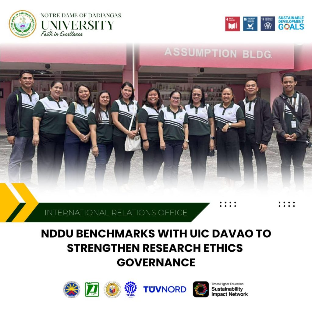 𝘎𝘦𝘯𝘦𝘳𝘢𝘭 𝘚𝘢𝘯𝘵𝘰𝘴 𝘊𝘪𝘵𝘺 – 𝘚𝘦𝘱𝘵𝘦𝘮𝘣𝘦𝘳 20, 2025 | 𝗡𝗼𝘁𝗿𝗲 𝗗𝗮𝗺𝗲 𝗼𝗳 𝗗𝗮𝗱𝗶𝗮𝗻𝗴𝗮𝘀 𝗨𝗻𝗶𝘃𝗲𝗿𝘀𝗶𝘁𝘆 (𝗡𝗗𝗗𝗨) reaffirmed its commitment to quality research and ethical governance through a benchmarking activity with the 𝙐𝙣𝙞𝙫𝙚𝙧𝙨𝙞𝙩𝙮 𝙤𝙛 𝙩𝙝𝙚 𝙄𝙢𝙢𝙖𝙘𝙪𝙡𝙖𝙩𝙚 𝘾𝙤𝙣𝙘𝙚𝙥𝙩𝙞𝙤𝙣 (𝙐𝙄𝘾) 𝙞𝙣 𝘿𝙖𝙫𝙖𝙤 𝘾𝙞𝙩𝙮 𝙤𝙣 𝙎𝙚𝙥𝙩𝙚𝙢𝙗𝙚𝙧 19, 2025. The visit focused on UIC’s Research Ethics Committee (REC), a recognized model for best practices in research ethics review and governance.