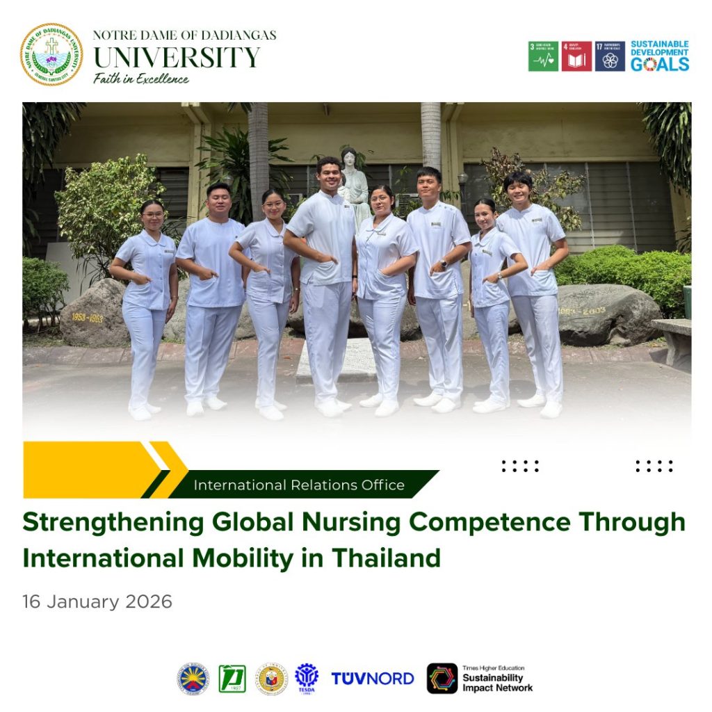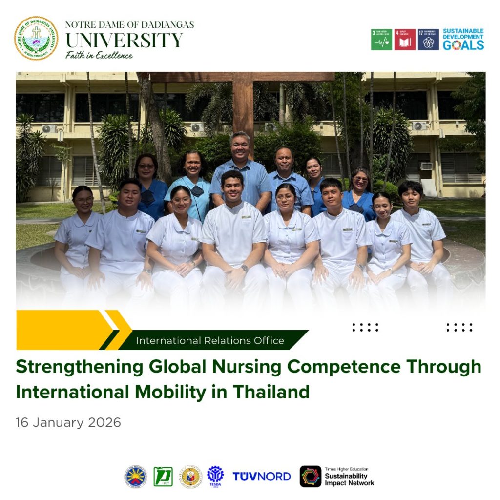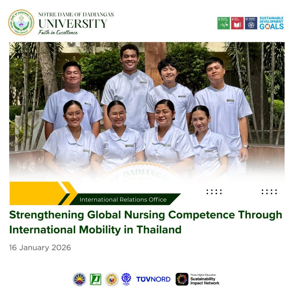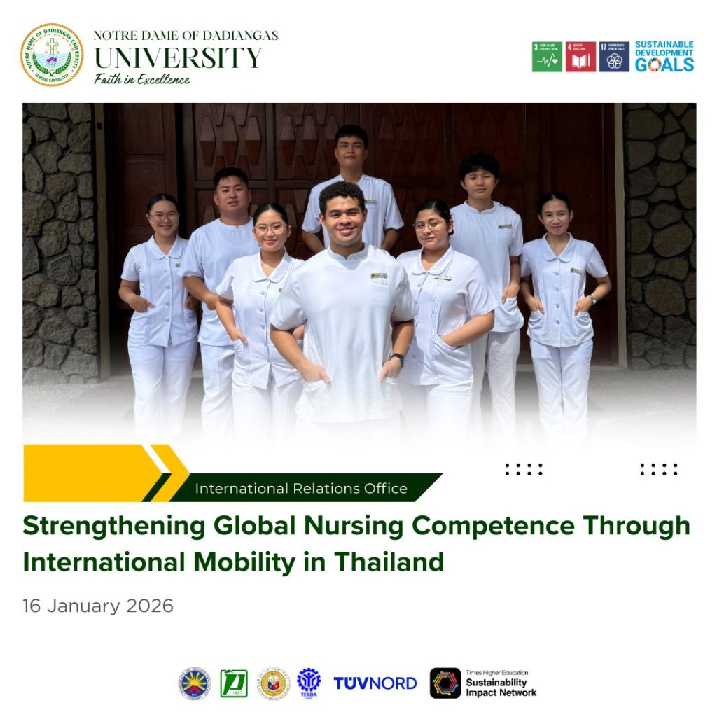 The International Relations Office of NDDU extends its best wishes to the participating students for a safe, meaningful, and enriching international learning experience. The University also expresses its sincere appreciation to Commission on Higher Education Region XII for endorsing the studentsโ travel to the Bureau of Immigration, making the international academic engagement possible.